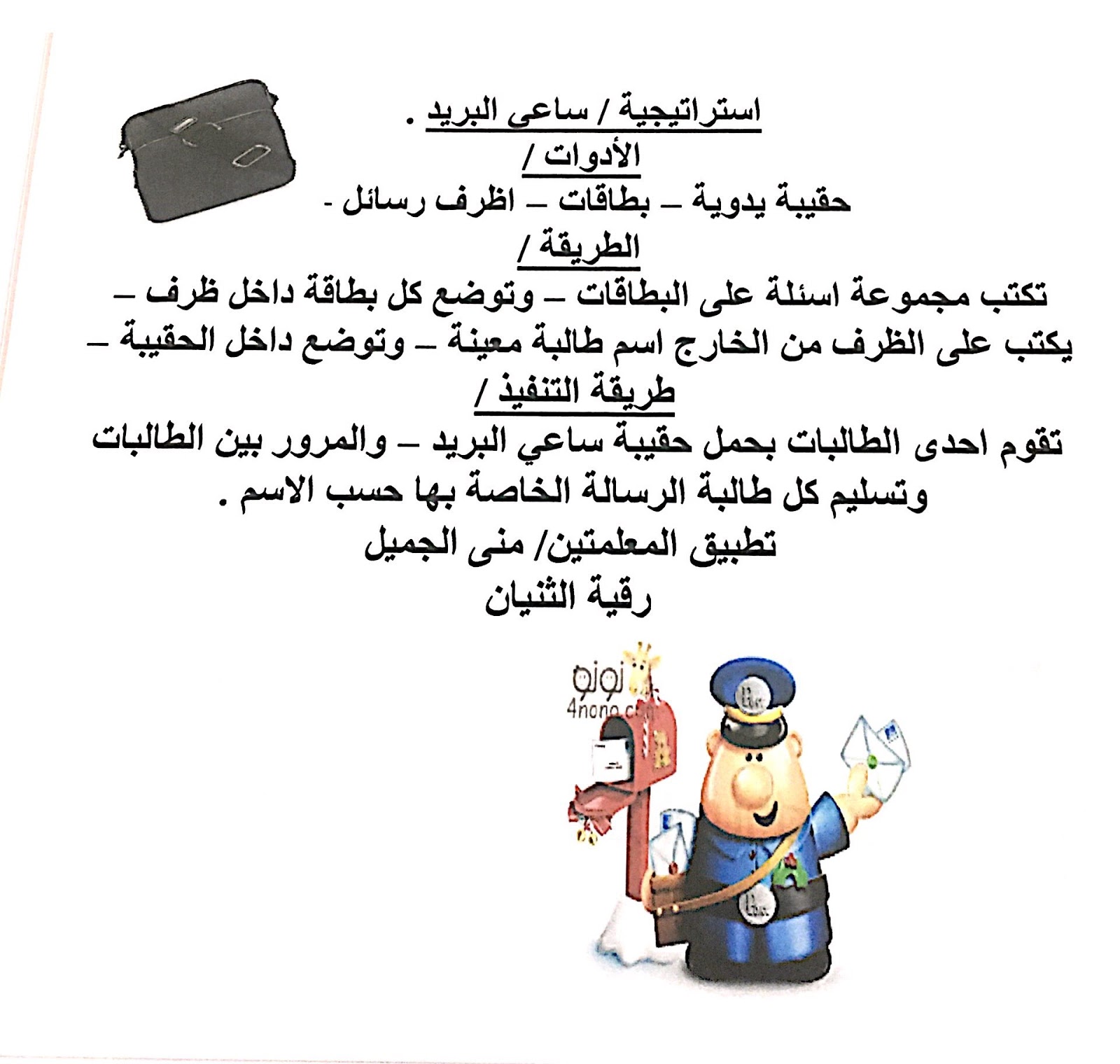 استراتيجية ساعي البريد. الادوات و هي الأظرف و الحقيبة اليدوية و البطاقات الطريقة و هي كتابة الاسئلة على البطاقات و وضع البطاقات داخل الاظرف و كتابة اسماء الراسلين و المرسل اليهم ثم وضعها في الحقيبة. استراتيجية ساعي البريد من استراتيجيات التعلم الايجابي من تلاميذ فصل 2 5. استراتيجية ساعي البريد او المرسل اهلين أنا طبقت استراتيجية ساعي البريد بالشكل التالي. فايز فياض استراتيجية ساعي البريد 3 1 ساعي.